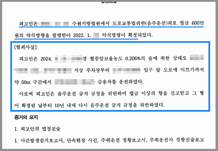 한편 호흡측정에 의한 의뢰인의 혈중알코올농도는 0.183%였으나 의뢰인은 이를 인정하지 아니하고 채혈측정을 요구하였고, 결국 혈중알코올농도 0.206%의 도로교통법위반(음주운전)으로 재판에 넘겨지게 되었습니다.