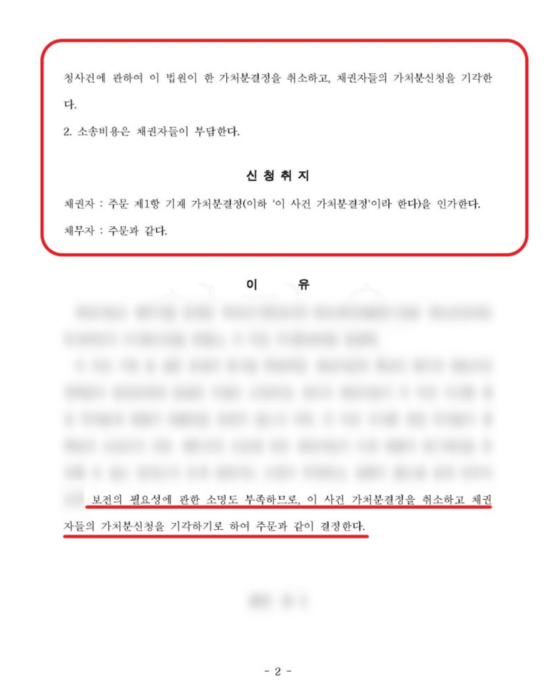 아래는 오늘 소개해드린 사안의 가처분 이의 신청 인용 취소 결정문입니다.