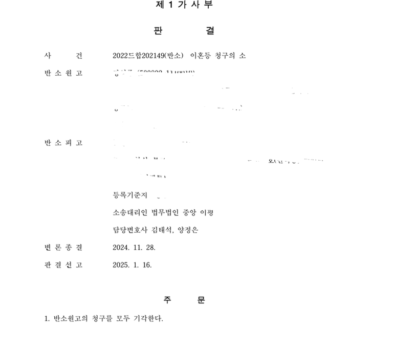 결국 4년에 걸친 소송에서 원고 즉 유책배우자인 남편의 이혼청구 및 재산분할은 모두 패소로 결론이 내려졌고, 그동안 아내는 아이들을 생각하며 남편의 외도와 폭행을 참아오고 축출이혼까지 당할 상황이었으나 이혼이 성립되지 않게 되었습니다.