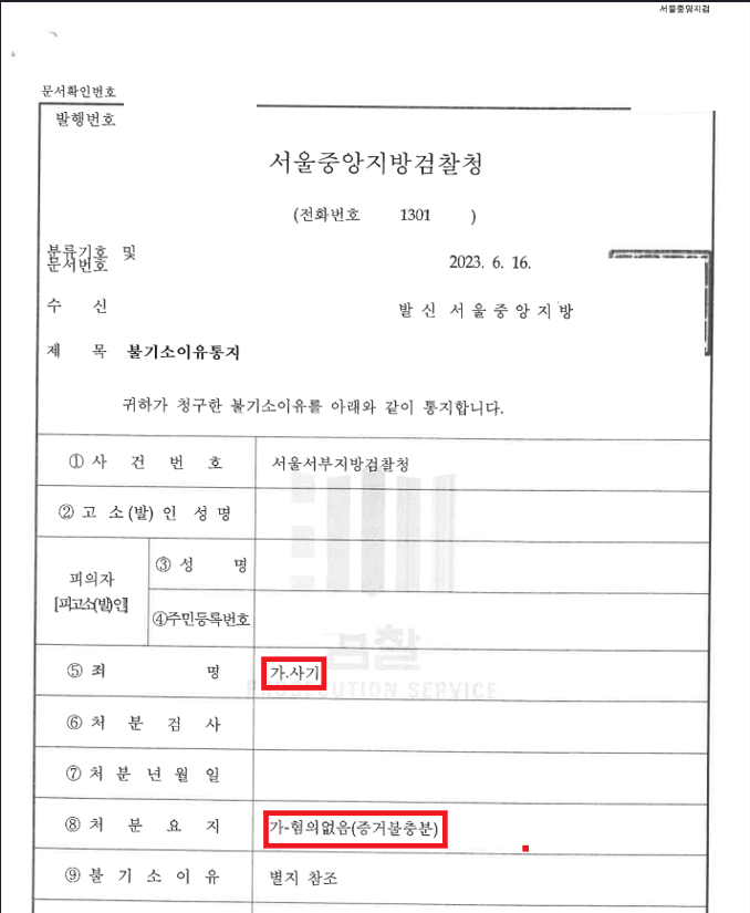 검사는 이러한 저의 주장의 전부 받아들여, 피의자의 사기 혐의에 대하여 전부 무혐의 처분을 하였습니다.