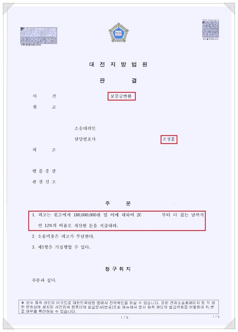 법원은 '피고는 원고에게 180,000,000원(보증금) 및 이에 대하여 지연이자를 지급하라'라는 판결을 내렸습니다.