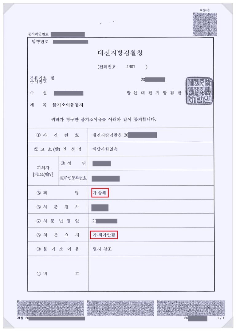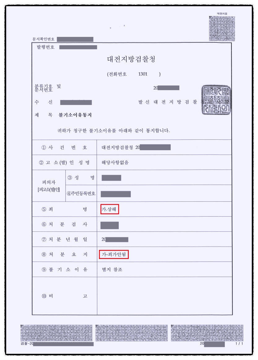 검사는 '죄가 안 됨(상해는 인정되나 정당방위에 해당하여 범죄를 구성하지 않음)' 불기소 처분을 하였습니다.