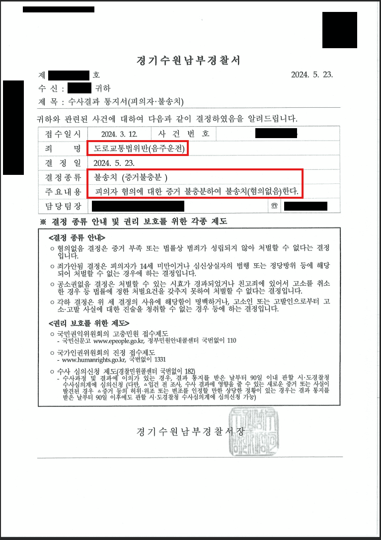 위와 같은 일관된 변호전략 끝에 사법경찰관은 의뢰인에 대하여 불송치(증거불충분) 결정을 내렸습니다.