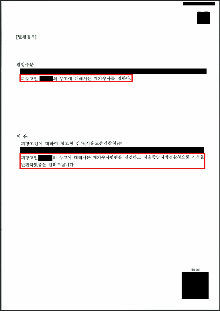 이에 서울고등검찰청은 A의 무고혐의에 대하여 재기수사를 명하여 주셨습니다.