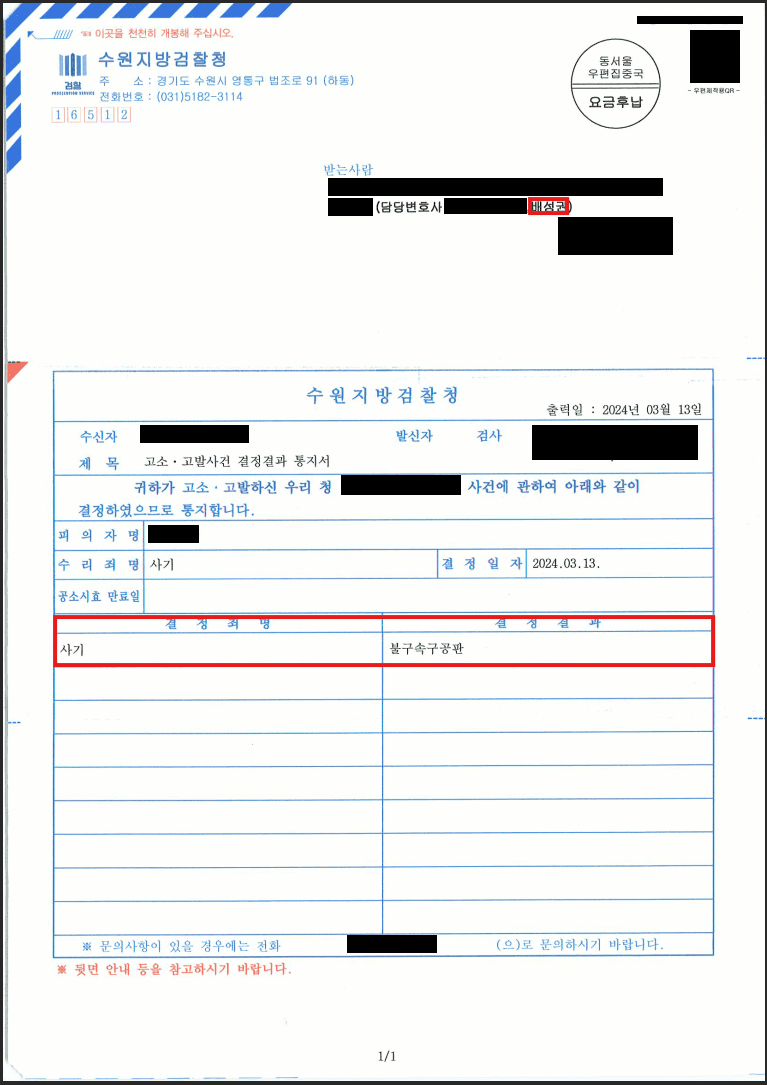 검찰은 A의 혐의를 인정하여 구공판처분을 하였습니다. 이후 형사재판을 받게 된 A는 의뢰인 B에게 연락하여 적극적인 합의의사를 표명하였고, 이에 B는 합의금을 수령하고 A에 대한 처벌불원서를 작성하여 주었습니다. 그 덕에 A는 집행유예 판결을 선고받게 되었습니다.