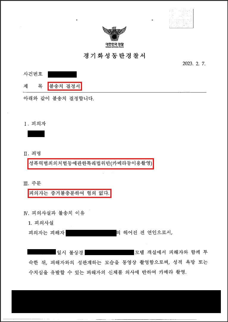 사법경찰관은 이와 같은 주장을 받아들여 의뢰인에 대한 성폭력범죄의처벌등에관한특례법위반(카메라등이용촬영) 혐의에 대하여 "증거불충분하여 혐의 없다."면서 불송치 결정을 내려주셨습니다.