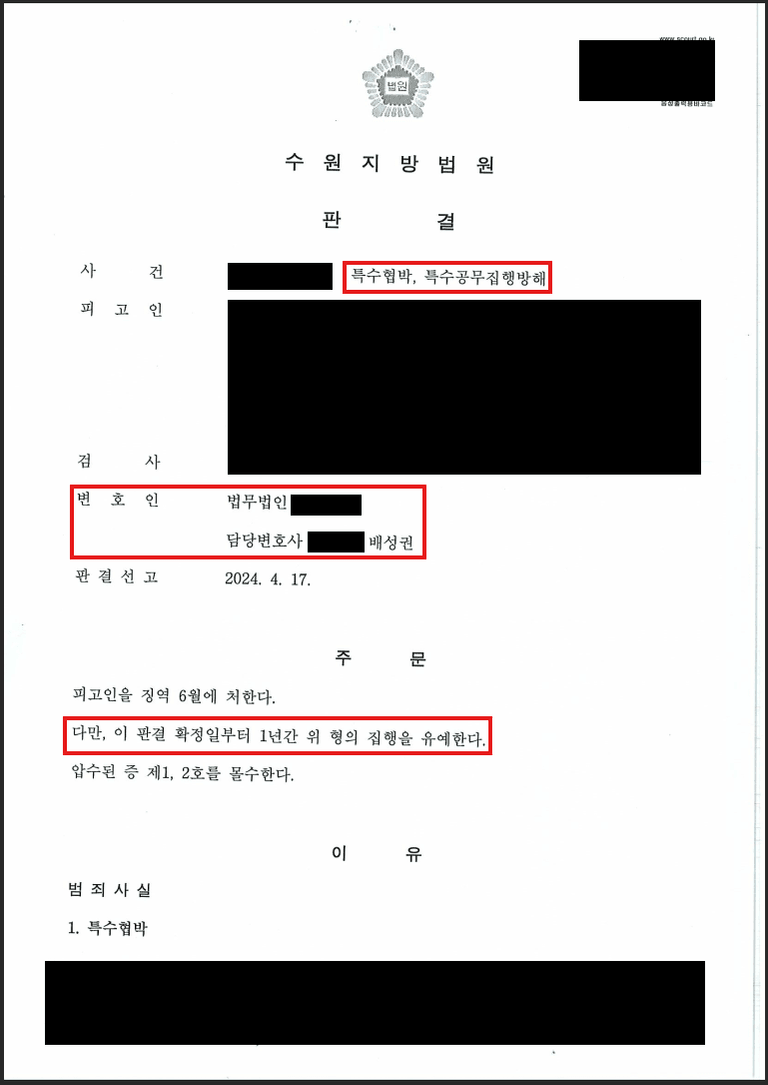 안녕하세요, 인천 법률사무소 송지 파트너 변호사 배성권입니다. 오늘은 제가 수행한 사건 중 의뢰인께서 특수협박, 특수공무집행방해 혐의로 재판을 받으셨으나 집행유예 판결을 받으신 사례를 소개합니다.