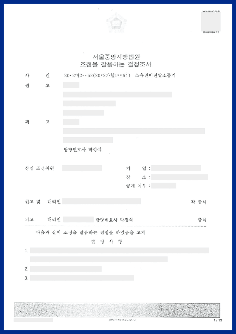 ② 원고는 나머지 청구를 포기한다고 하면서, 이상을 바탕으로 원고와 피고 사이의 문제를 원만히 해결하는 조정이 성립되었습니다.