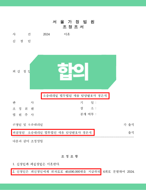 유책배우자 이혼소송 청구는 애초에 받아들여지지 않는 행위였기 때문에 법무법인 새움에서는 B씨를 강하게 압박하였고, 그 결과 이혼 위자료 4천만 원을 지급받는 조건으로 조정이혼을 성립시킬 수 있었습니다.