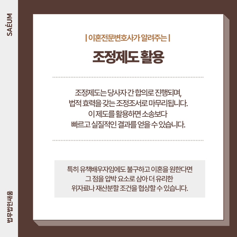 법원 조정제도는 당사자 간 합의를 바탕으로 진행되며, 법적 효력을 갖는 조정조서로 마무리됩니다. 이 제도를 활용하면 소송보다 빠르고 실질적인 결과를 얻을 수 있습니다. 특히 유책배우자임에도 불구하고 이혼을 원한다면, 그 점을 압박 요소로 삼아 더 유리한 위자료나 재산분할 조건을 협상할 수 있습니다.