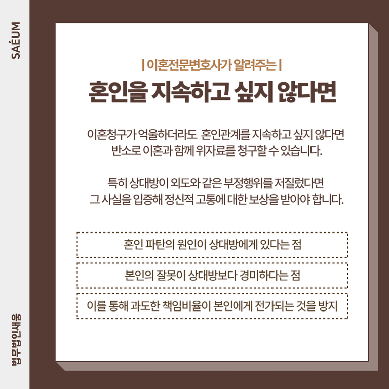 상대방의 이혼청구가 억울하더라도, 혼인관계를 지속하고 싶지 않다면 반소로 이혼과 함께 위자료를 청구할 수 있습니다. 특히 상대방이 외도와 같은 부정행위를 저질렀다면 그 사실을 적극적으로 입증해 정신적 고통에 대한 보상을 받아야 합니다.