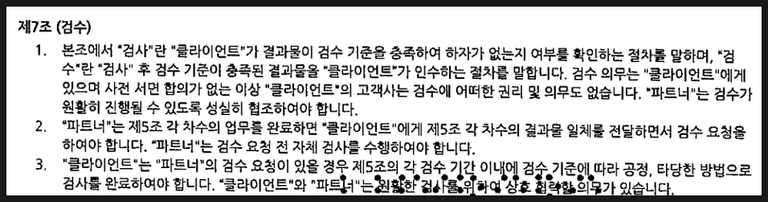실제로 문제가 된 검수 조항으로, '공정 타당한 방법', '상호협력' 등 모호한 문구로 작성되어 있습니다.
