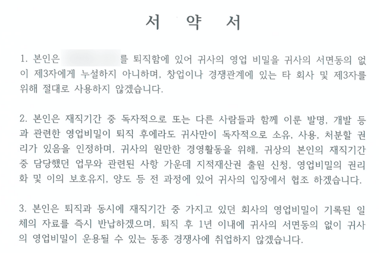 다만 퇴사 시 작성하는 경쟁사 취업 제한 서약서(전직금지 서약서)에 서명했더라도, 해당 서약이 모든 경우에 법적으로 유효한 것은 아닙니다.