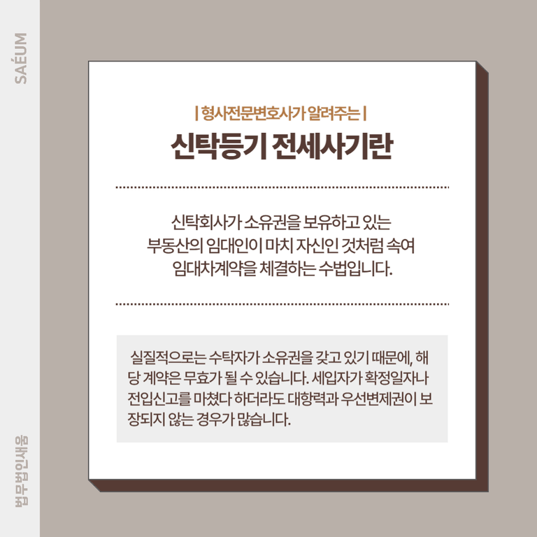 신탁 전세사기, 피해가 확산되기 전에 정확한 법률 조치로 해결책을 찾아야 할 시점입니다. 피해를 입었다면 혼자 고민하지 마시고, 부동산 전문변호사의 도움을 통해 빠르게 대처하시기 바랍니다.
