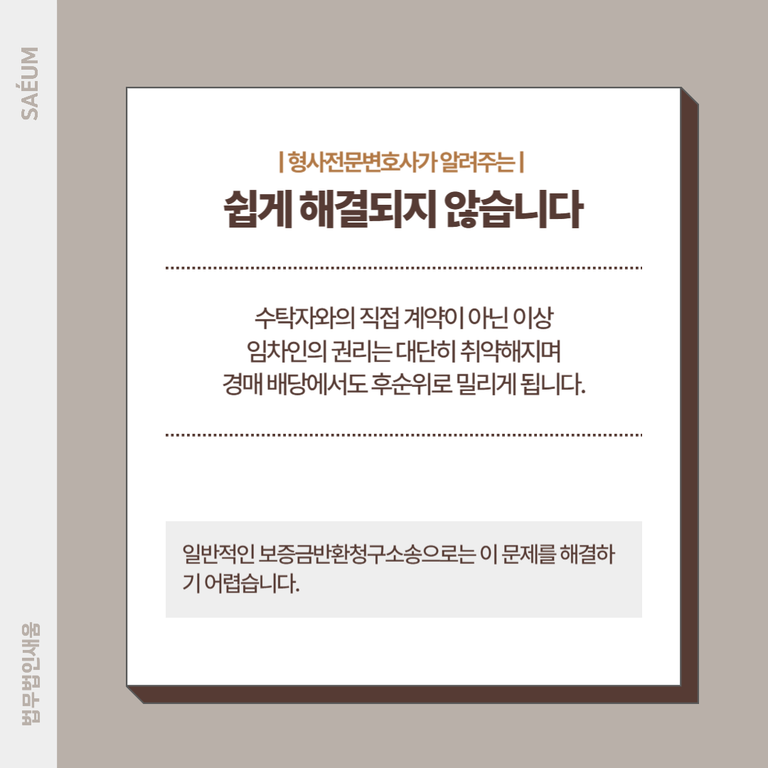 문제는 일반적인 보증금반환청구소송으로는 이 문제를 해결하기 어렵다는 점입니다. 수탁자와의 직접 계약이 아닌 이상, 임차인의 권리는 대단히 취약해지며, 경매 배당에서도 후순위로 밀리게 됩니다. 이에 따라 피해자는 보증금을 돌려받지 못한 채 손해를 입게 됩니다.