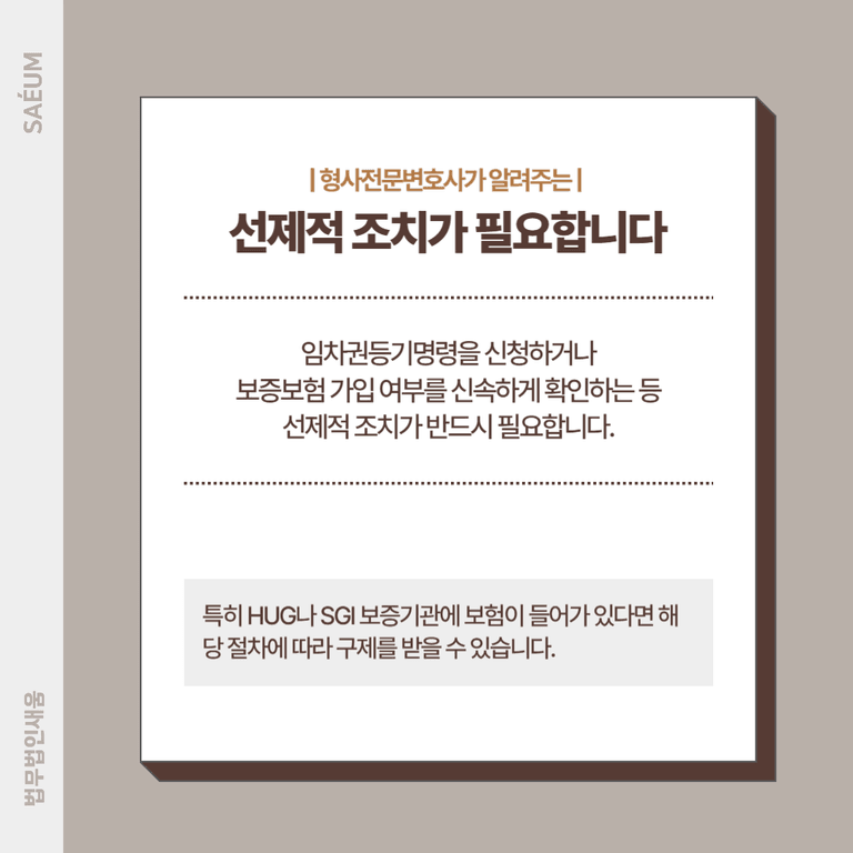 이러한 상황에서 임차권등기명령을 신청하거나, 보증보험 가입 여부를 신속하게 확인하는 등의 선제적 조치가 반드시 필요합니다. 특히 HUG나 SGI 보증기관에 보험이 들어가 있다면 해당 절차에 따라 구제를 받을 수 있습니다.