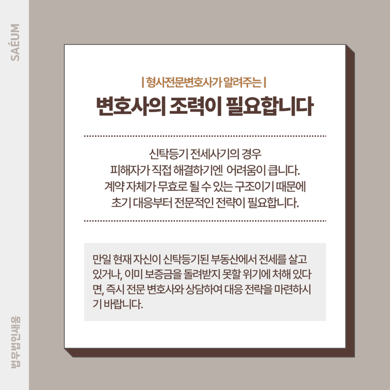 만일 현재 자신이 신탁등기된 부동산에서 전세를 살고 있거나, 이미 보증금을 돌려받지 못할 위기에 처해 있다면, 즉시 전문 변호사와 상담하여 대응 전략을 마련하시기 바랍니다. 초기 대응이 늦어질수록 회복할 수 있는 금액은 줄어들 수 있습니다.