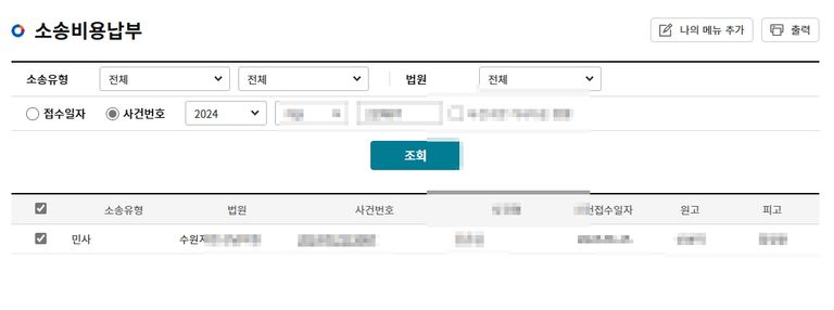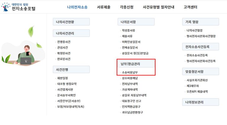 나의전자소송에서 "납부/환급관리", "소송비용 납부"를 클릭합니다.