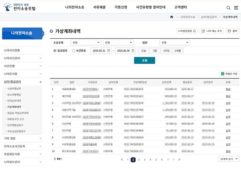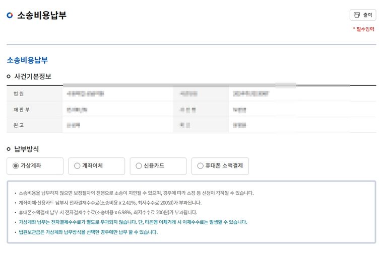 결제정보에서 은행을 선택하고 소송비용납부를 클릭하면 가상 계좌가 생성됩니다.