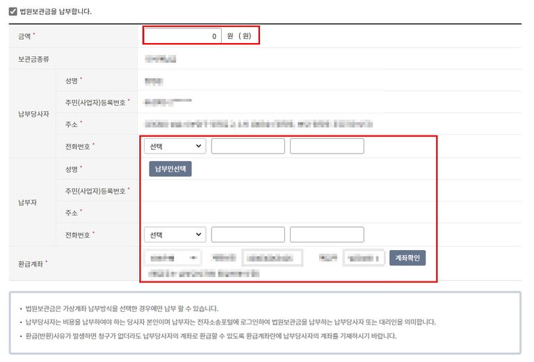 금액에는 법원의 보정명령에 기재된 금액을 그대로 입력해 줍니다. 납부 당사자의 경우 통상 소송당사자의 인적 사항을 넣어 줍니다. 납부자는 납부당사자 또는 소송대리인 등을 의미합니다(개별 상황에 따라 다를 수 있으므로 확인해 보시기 바랍니다). 빈곳을 모두 채워줍니다. *로 표시된 부분은 모두 기입해 주어야 합니다.