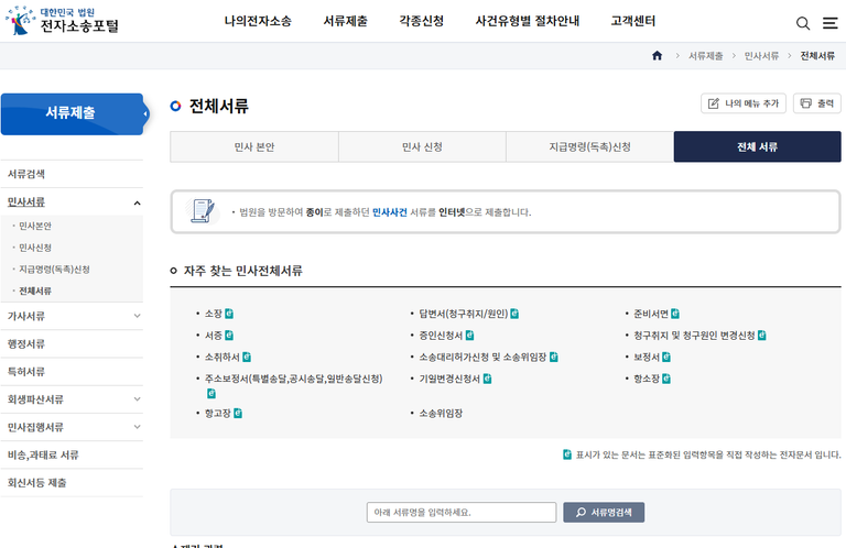 서류제출 항목에서 보정서를 클릭합니다! 자주 찾는 민사전체서류에서 보정서를 쉽게 검색을 하실 수 있습니다.