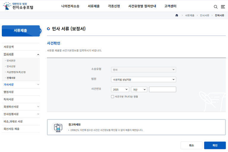 법원과 사건번호를 입력하고 확인을 클릭합니다(위 화면은 예시입니다).