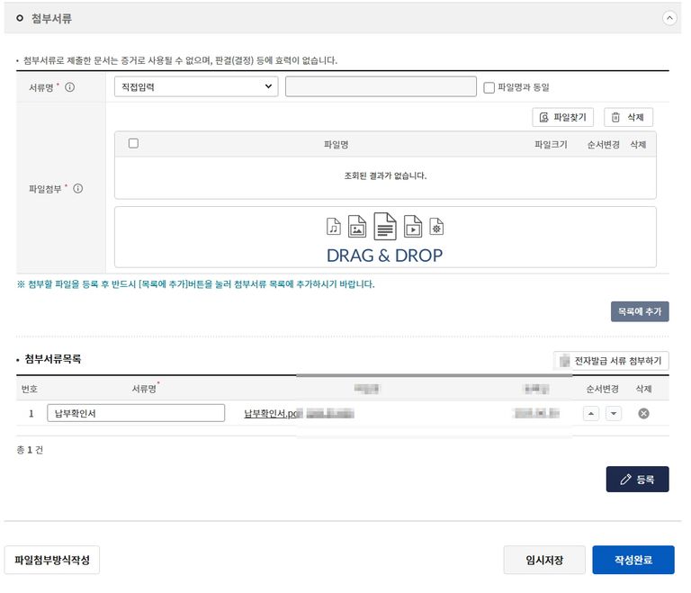 첨부 서류에는 앞서 pdf로 저장한 납부내역서를 첨부합니다. 드래그 앤 드롭으로 편리하게 파일을 설정해 줄 수 있습니다. 서류명은 "납부확인서" 등 적절히 입력해 줍니다.