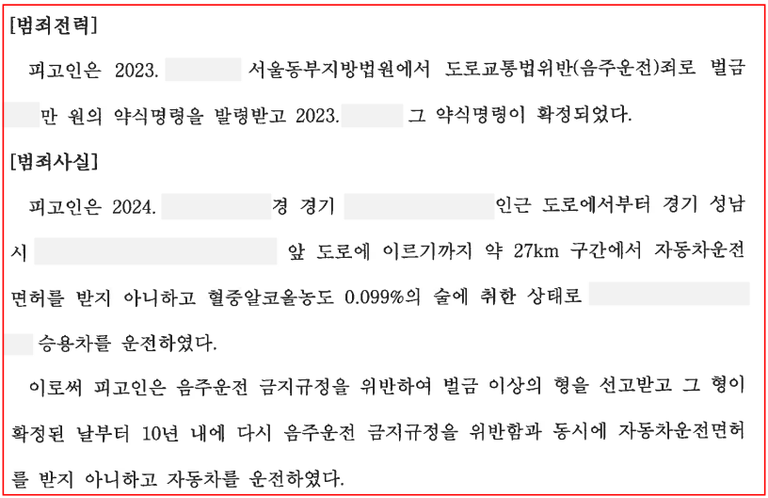 본 변호인은 의뢰인이 2023년도에 음주운전으로 벌금형을 선고받은 것 이외에는 형사 처벌을 받은 전력이 없다는 것을 강조했습니다.