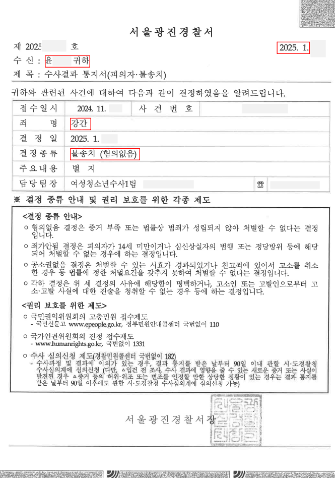 이외에도 고소인의 진술에 신빙성이 없다는 점을 밝힌 결과, 본 사건은 경찰단계에서 불송치로 종결되었습니다.