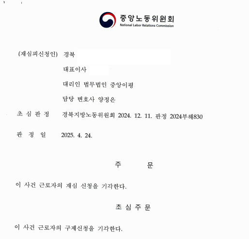 법무법인 중앙 양정은변호사은 사용자가 중대재해 발생 후 안전조치 의무를 다하였음을 입증하고, 다른 근로자들은 안전하게 정상적으로 근무를 제공하고 있어, 위 근로자 7인의 근무명령 미이행 즉 무단 결근을 징계사유가 된다는 점을 소명하여 초심에서와 같이 재심에서도 부당해고가 아니라 정당한 해고임을 증명하였습니다.