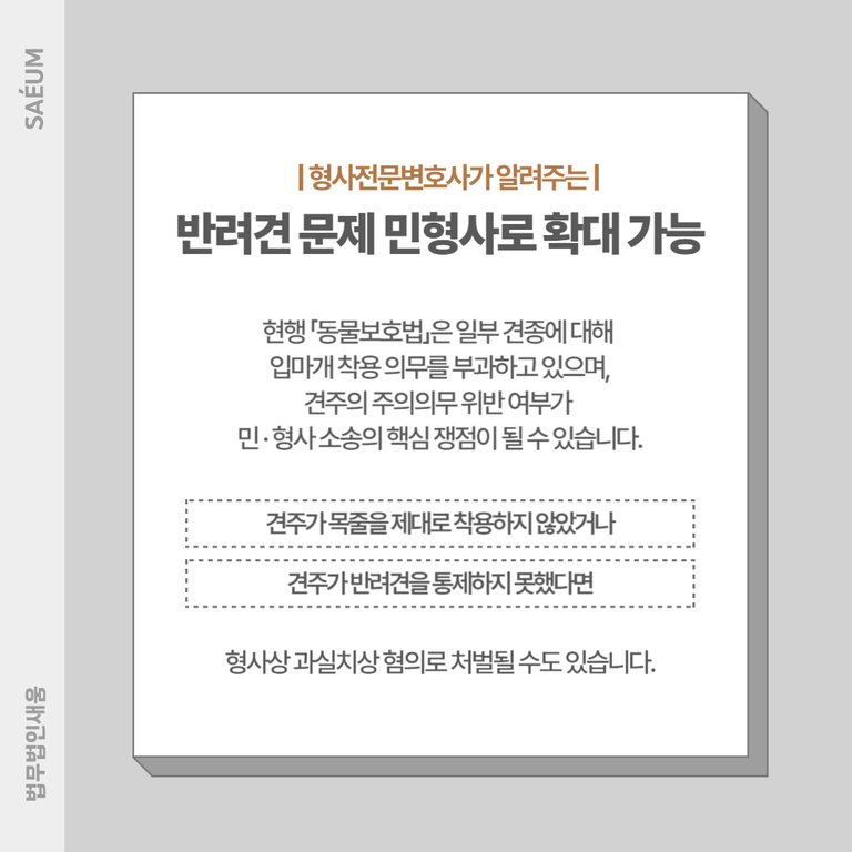 특히 현행 「동물보호법」은 일부 견종에 대해 입마개 착용 의무를 부과하고 있으며, 견주의 주의의무 위반 여부가 민사·형사 소송의 핵심 쟁점이 될 수 있습니다.
