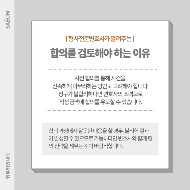 다만, 합의 과정에서 법률지식이 부족하거나 대응을 잘못할 경우, 오히려 불리한 결과가 발생할 수 있으므로, 가능하다면 전문가와 함께 협의 전략을 세우는 것이 바람직합니다.