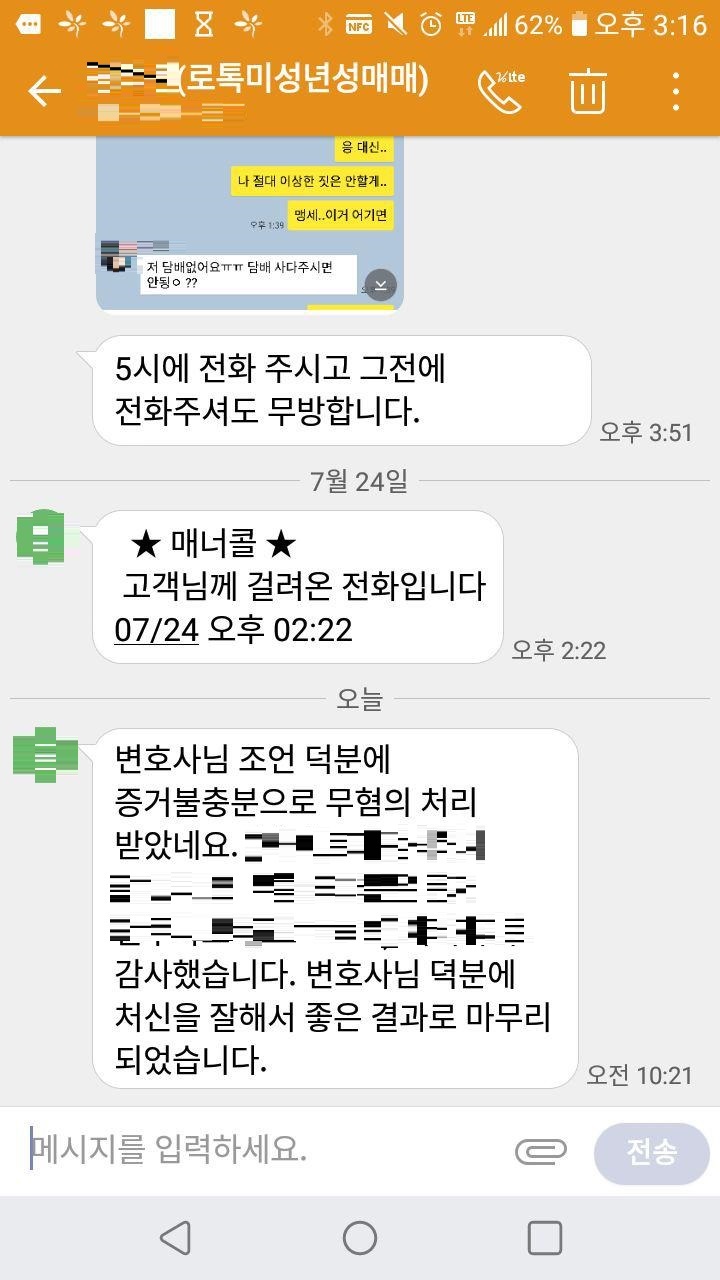 예를 들어, 정○○님은 미성년자성매매혐의로 수사를 받게 되었습니다. 정○○님은 미성년자성매매혐의가 억울하지만 변호사를 정식으로 선임할 상황은 아니어서 2018. 7.경부터 5차례 전화상담을 통해 경찰 수사 및 검찰 수사를 준비하셨습니다. 결국 아래와 같이 미성년자성매매혐의에 관하여 무혐의 처분을 받으시고 감사 문자를 주셨습니다.