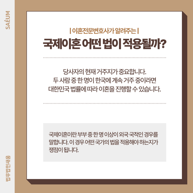 이처럼 국제이혼 사건은 거주지, 자산의 소재지, 배우자의 국적 등 다양한 요소가 얽혀 있기 때문에 일반적인 이혼사건과는 접근 방식이 완전히 다릅니다.