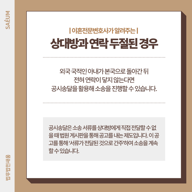 예를 들어 베트남 국적인 아내가 본국으로 돌아간 후 전혀 연락이 닿지 않는다면, 공시송달을 활용해 소송을 진행할 수 있습니다.