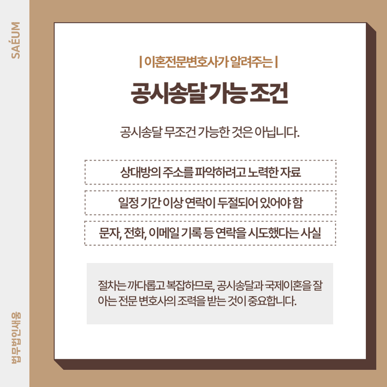 절차는 까다롭고 복잡하므로, 공시송달과 국제이혼을 잘 아는 전문 변호사의 조력을 받는 것이 중요합니다.