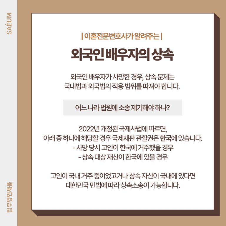 외국 국적의 배우자가 사망한 경우, 상속 문제 역시 국내법과 외국법의 적용 범위를 정확히 따져야 합니다. 이때 핵심 개념은 국제재판 관할권과 준거법입니다.
