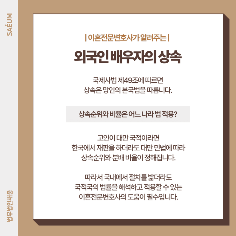 따라서 국내에서 절차를 밟더라도 국적국의 법률을 해석하고 적용할 수 있는 변호사의 도움이 필수입니다.