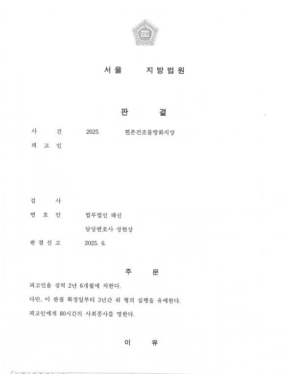 현존건조물방화치상죄 사건의 "집행유예" 선고 사례를 소개드리겠습니다.