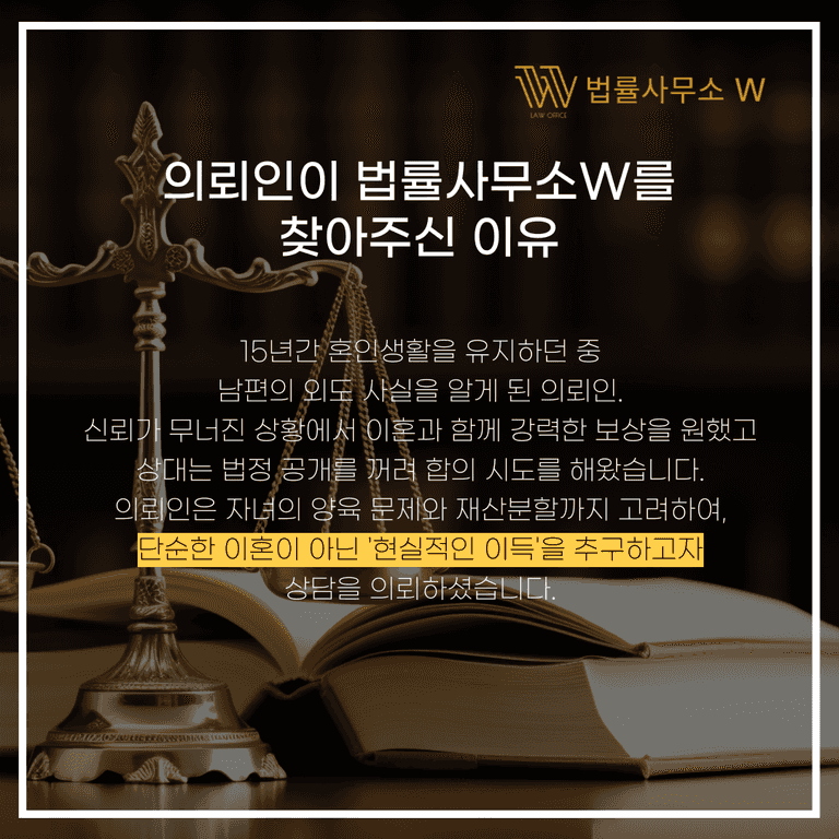 오늘은 남편의 외도 이후 5천만 원 위자료와 2억 3천만 원의 재산분할을 이끌어낸 사례를 소개드립니다.