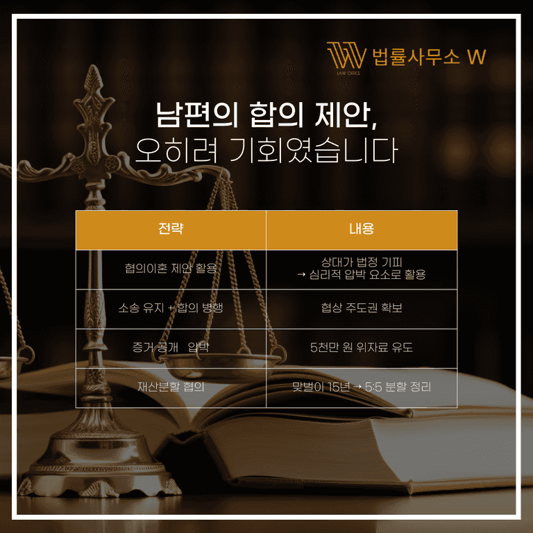 법정 출석을 꺼리는 상대의 심리를 이용해, "소송 지속 시 증거 제시"라는 압박을 통해 5,000만 원의 위자료를 이끌어냈습니다.