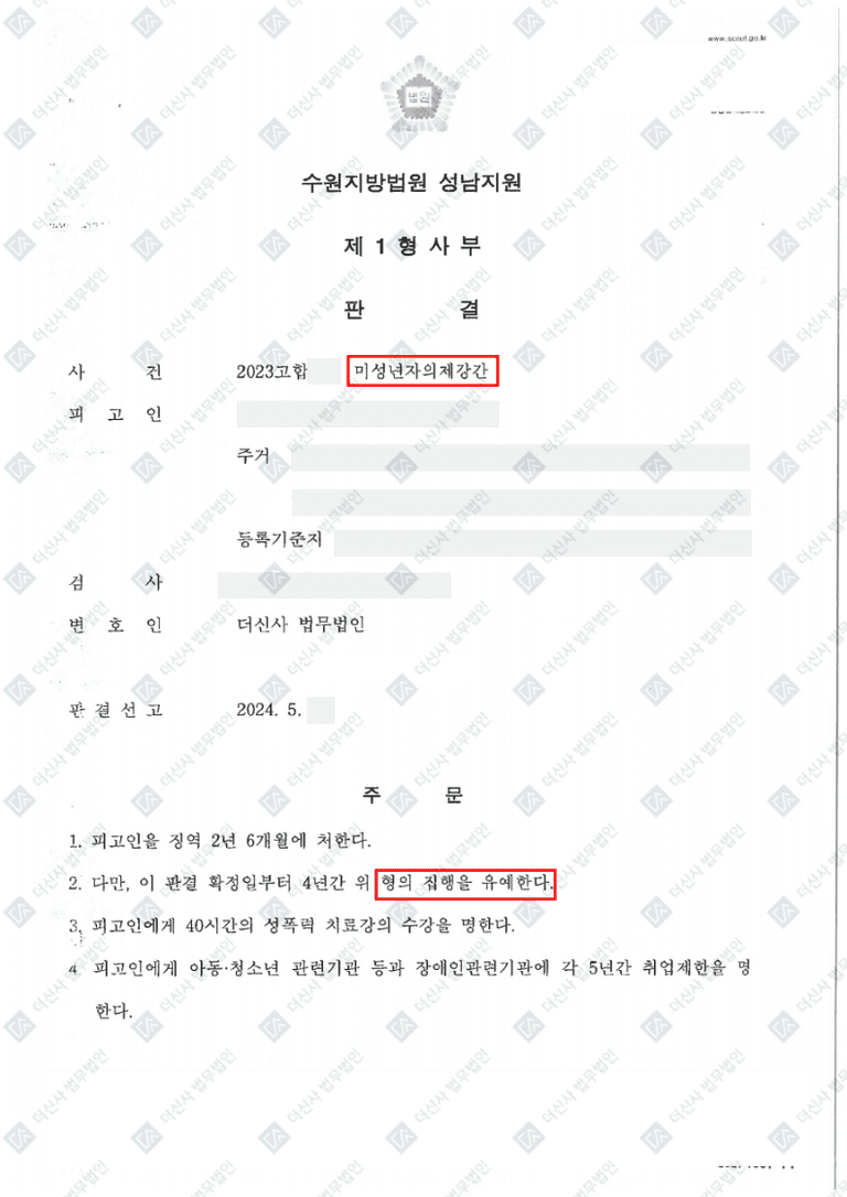 재판부는 “범죄 자체는 중하나, 피고인이 깊이 반성하고 있고, 재범 방지를 위한 노력을 하고 있다는 점을 고려”하여 징역 2년 6개월에 집행유예 4년, 보호관찰 및 성폭력 치료강의 수강 명령을 선고했습니다.