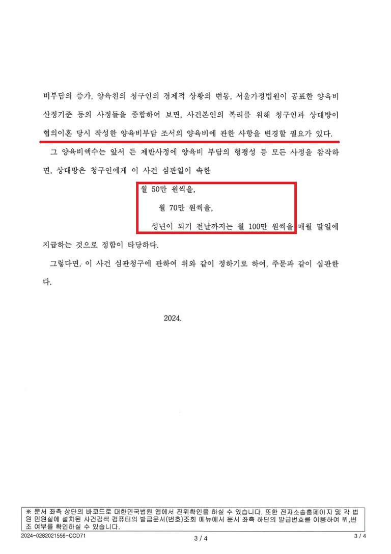 월 100만 원씩 (50만 원 증가) 양육비를 지급하라고 판결하였습니다.