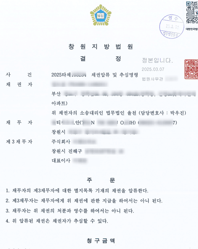 채권자는 2025년 2월 19일, 창원지방법원에 채권압류 및 추심명령 신청을 제기했습니다. 청구금액은 원금 2,000만원과 이자 3,951,780원, 집행비용 34,800원을 합한 총 23,986,580원이었습니다. 압류 대상은 채무자(베트남 여성)가 근무하는 회사(주식회사 *****)로부터 받는 급여채권이었습니다.