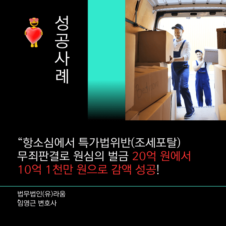 [성공사례] 항소심에서 특가법위반(조세포탈)부분 무죄판결로 원심의 벌금 20억 원을 10억 1천만 원으로 감액 성공!