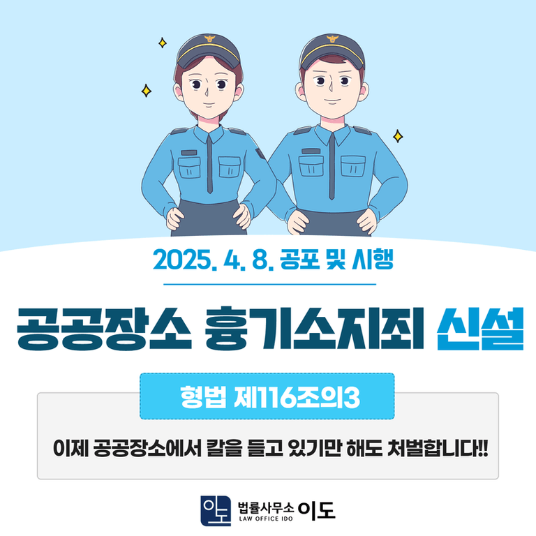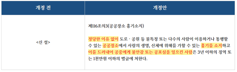 이에 법무부는 대검찰청 건의에 따라 공공장소 흉기소지죄 신설을 추진하였고, 마침내 '공공장소 흉기소지죄'를 포함한 형법 개정안이 2025. 4. 8. 공포 및 시행되었습니다.