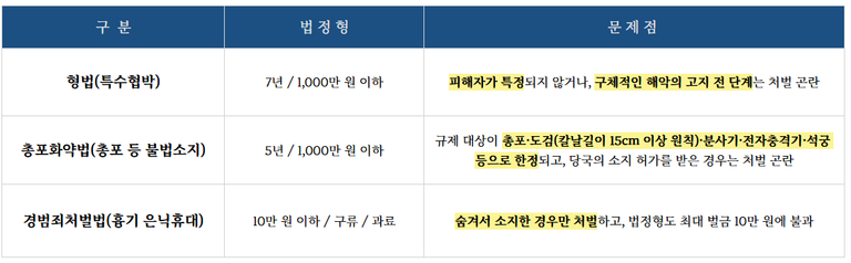 그런데 막상 범행 이전 단계, 즉 흉기를 소지하고 있는 것만으로는 당시 현행법상 적절한 처벌이 어려운 법적 한계가 있었습니다.