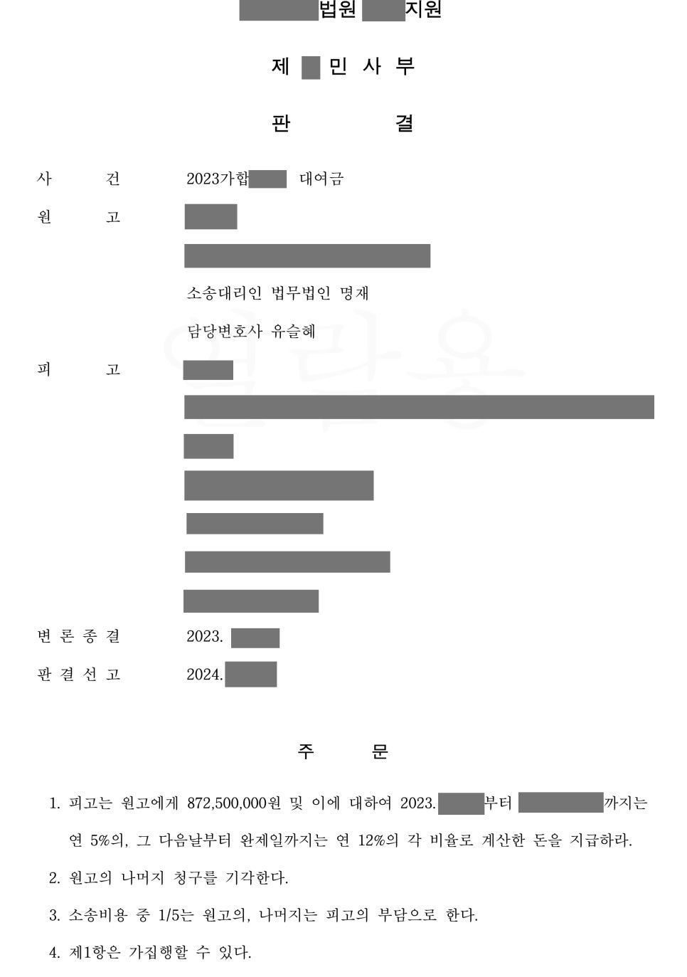 소송 비용 포함 약 10억 원 전액을 원고에게 지급하라는 판결을 내렸습니다.