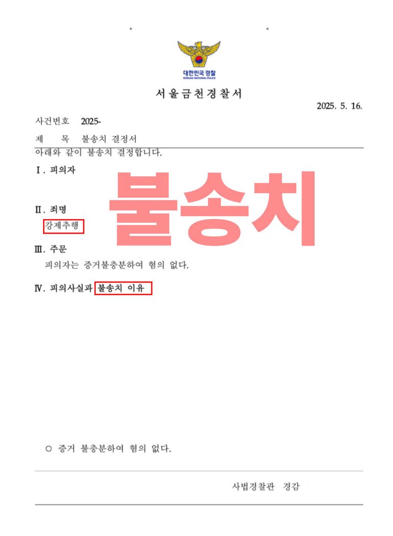 형법상 강제추행으로 보기 어렵다는 결론을 내리고 혐의없음(불송치) 결정을 내렸습니다.