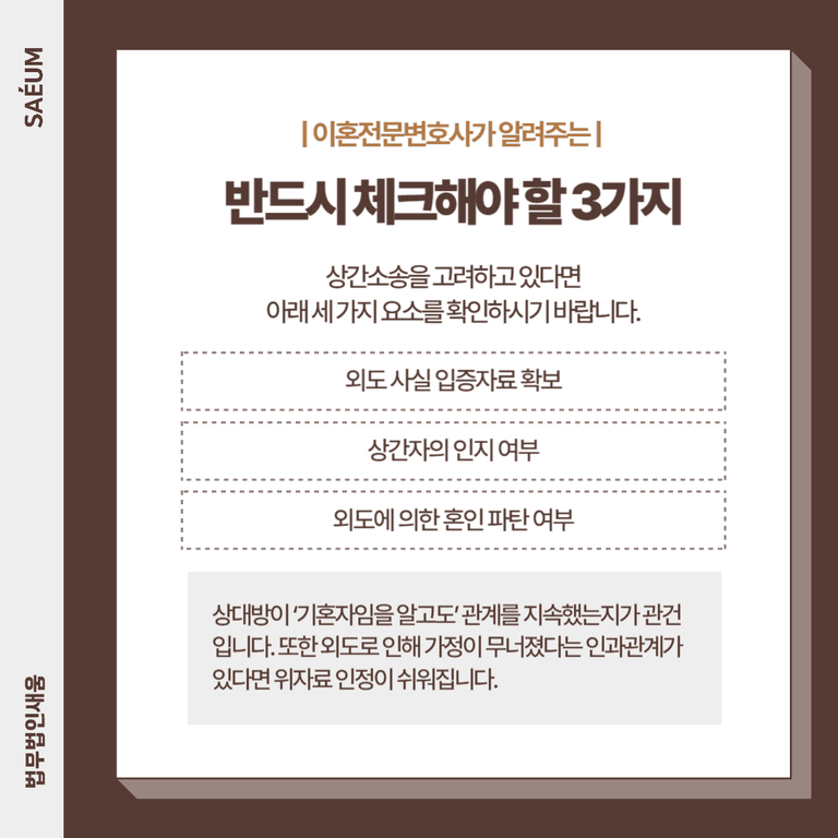 상간소송을 고려하고 있다면 아래 세 가지 요소를 확인하시기 바랍니다.